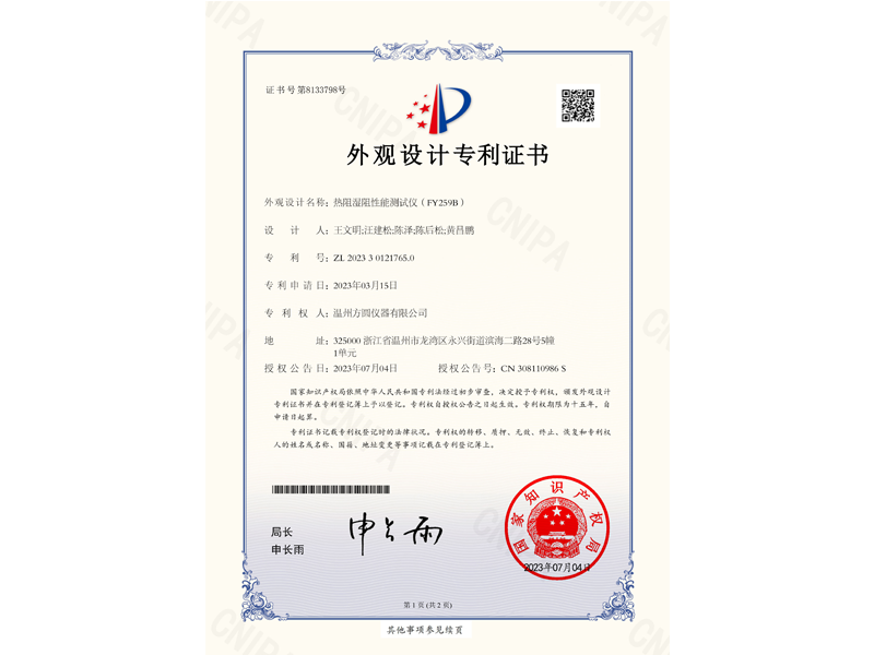 中國外觀設計專利:熱阻濕阻性能測試儀(ZL 2023 3 0121765.0)